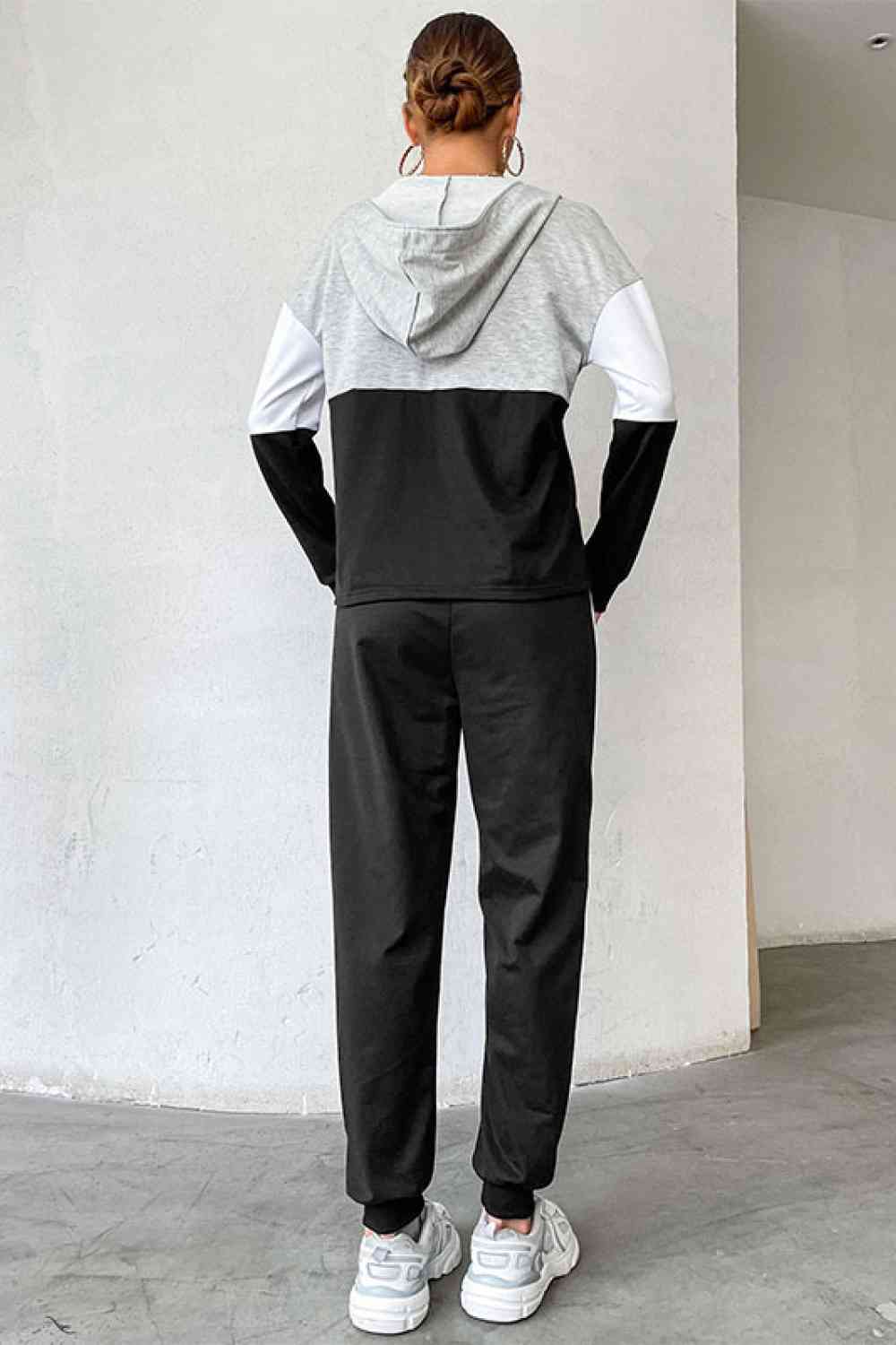 - Features: Long sleeves, half zip, drawstring, two-piece set